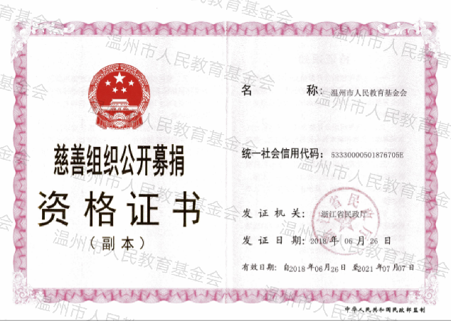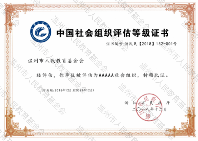 温州市人民教育基金会是由1989年7月3日温州市人民政府发文批准设立,2001年8月1日省民政厅注册登记的公募基金会,业务主管单位为浙江省教育厅。2016年9月《中华人民共和国慈善法》正式颁布实施之后,我会于2017年7月被认定为慈善组织,并获得公开募捐资格。2018年被浙江省民政厅评为最高等级--AAAAA级社会组织。