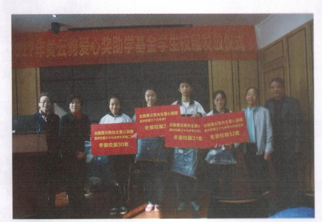 2017年12月6日,“黄云驹爱心奖助学基金首发放仪式”在温州市三十九中学隆重举行,陈莲莲会长代表黄云驹先生给该校456名同学送上定制的冬装校服,让他们在刺骨的寒冬感受到来自海峡彼岸的爱心和温暖,并由此发出感恩之心。