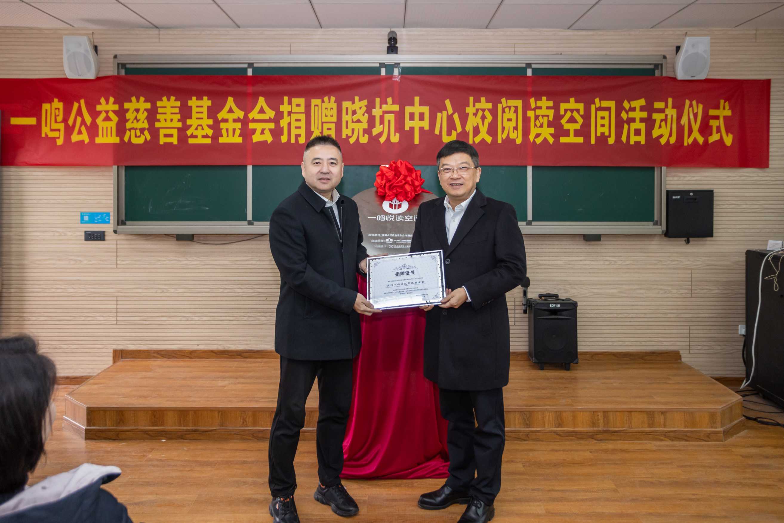 今天,温州市人民教育基金会与温州一鸣公益慈善基金会在晓坑中心校为孩子们的“悦读空间”举行了揭牌仪式。温州市教育局党委委员、副局长张维凯,温州市教育局人事处副处长林德格,平阳县人民政府副县长屠霁霞,平阳县教育局书记、局长林侠,平阳县怀溪镇党委书记张其洋,平阳县教育局党委委员、副局长詹淼,温州市人民教育基金会秘书长赵坚琳,温州市人民教育基金会副秘书长张海坚,浙江一鸣食品股份有限公司董事长朱立科,浙江一鸣食品股份有限公司学生营养事业部总经理吴孝松,温州一鸣公益慈善基金会秘书长薛蕾蕾,开合建筑设计事务所创始人崔海峰,市教育局、平阳县人民政府、怀溪镇人民政府其他干部及晓坑中心校教生们出席了本次仪式。